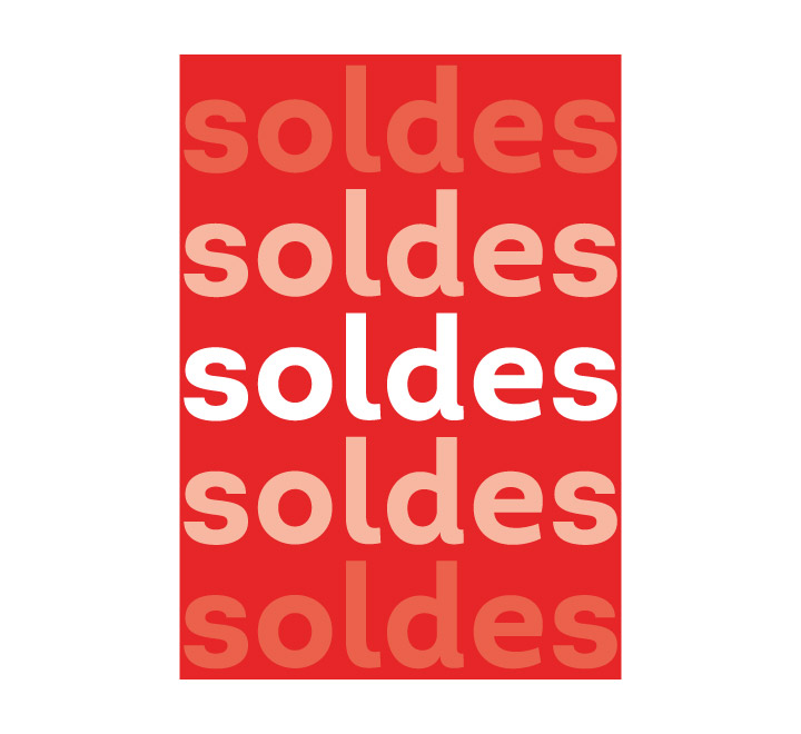 Affiche pour les soldes à suspendre en décoration dans la vitrine de votre magasin. Décoration professionnelle avec comme couleur d’écriture un dégradé d’opacité blanc sur un fond rouge qui vous assurera une communication percutante auprès de vos clients.