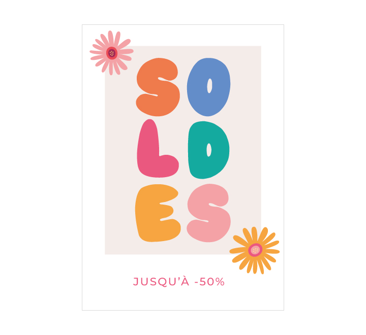 Affiche soldes d’été pour décorer la vitrine de votre boutique. Jolie affiche ” SOLDES ” aux couleurs d’été avec deux petites fleurs et le texte ” Jusqu’à -…” . Vous avez la possibilité de choisir le pourcentage ainsi que le format de votre choix.