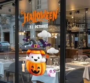 Total sales: 5 pcs.Sticker vitrine pour les fêtes de Pâques PA063 Adhésif ” Joyeuses Pâques ” écrit dans une écriture moderne et accompagné de petits dessins illustrant l’esprit de Pâques pour une décoration colorée de votre vitrine pour les fêtes de Pâques.